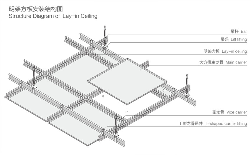 明架方板吊頂由裝飾面板、明骨、上層輕鋼主龍骨以及相關配件共同構成。板面平整,棱線分明,吊頂系統規整、大方、典雅、視野開闊。明架方板具備阻燃、防腐、防潮的優點,而且裝拆方便,每件板均可獨立拆裝,方便施工維護和清潔。